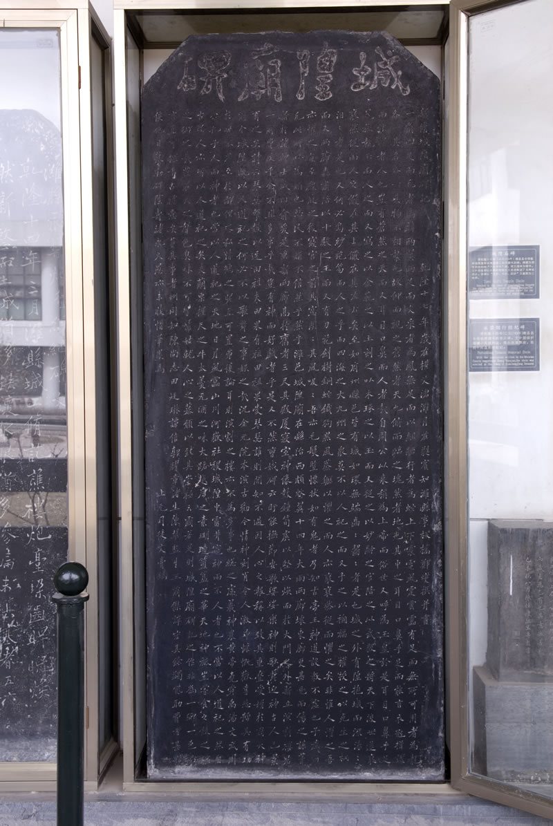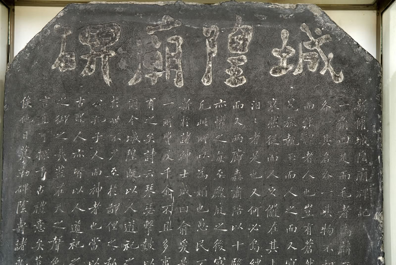 《新修城隍庙碑记》,高190厘米,宽80厘米,厚20厘米,碑文20行,全文909字。因该碑“文佳、书好、刻精”,被后人誉为“三绝碑”。郑板桥对该碑也是极为中意,他在《刘柳林册子》中曾经写道:“潍县城隍庙碑最佳,惜其拓本少尔。”