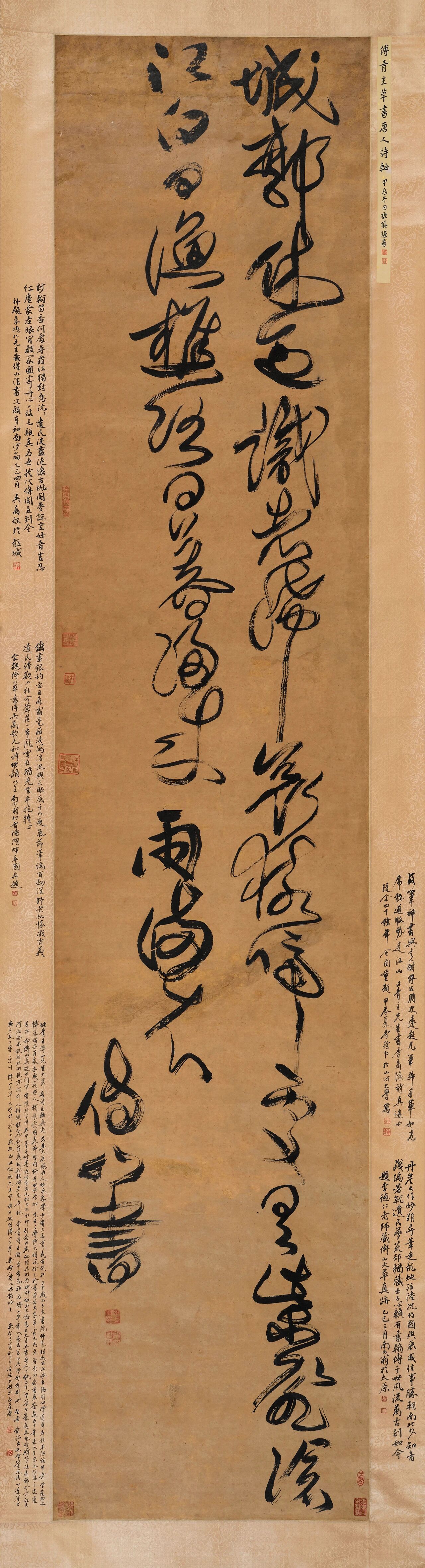 “此青主傅山先生大草唐诗巨轴真迹。先生太原阳曲人,幼承家学,少有大志,重义有侠行。三十岁入三立书院,师袁继咸公,上承阳明心学,遂摒弃程朱陋论。中年学道,加之博采诸子百家,遂成一代哲人。独秉爱国气节,坚持终身,世所景仰。先生之学博大精深,发之于书,遂成大家,草书尤为卓著。余向爱书画鉴藏。五十年来,入手宋元明清之迹逾千件,而傅山真迹世间罕有,仅得十件。其中《墨子经墨迹册》,曾由文物出版社印行面世,其他惜未刊行。此件纸本大幅,高七尺寸五,书唐人七绝二十八字,笔力豪迈,气势磅礴,笔法连绵如长江大河,滔滔不绝,超然洒脱,不蹈前人径蹊。结篇收笔顿然挫锋,更为奇绝。余尝谓王铎草书为神品,傅山草书入逸品,盖由其学术有别也。往年余倡文化学鉴定法,以道鉴书画,显见二家之不同。傅山大草大皆作于七十岁后,而此幅的为杰作。诸公欲悟傅山大草要妙,请以此幅证之。岁癸巳二月三日,李德仁题于存道堂。”