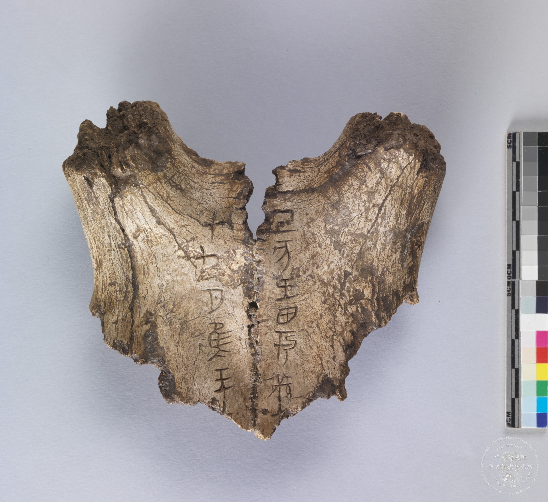 带刻辞鹿头骨《甲》3940 记载殷王帝乙或帝辛时期征讨方国后,回程在蒿地田猎,获得猎物祭祀文武丁(武乙与文丁)之事;与《甲》3941同为目前出土唯二带刻辞鹿头骨。 释文:戊戌王蒿田,文武丁…… 典藏号:R041038 年代:商代晚期 尺寸:长22.7×宽20.2cm 出土地:河南省安阳县小屯E10坑 材质:鹿头骨