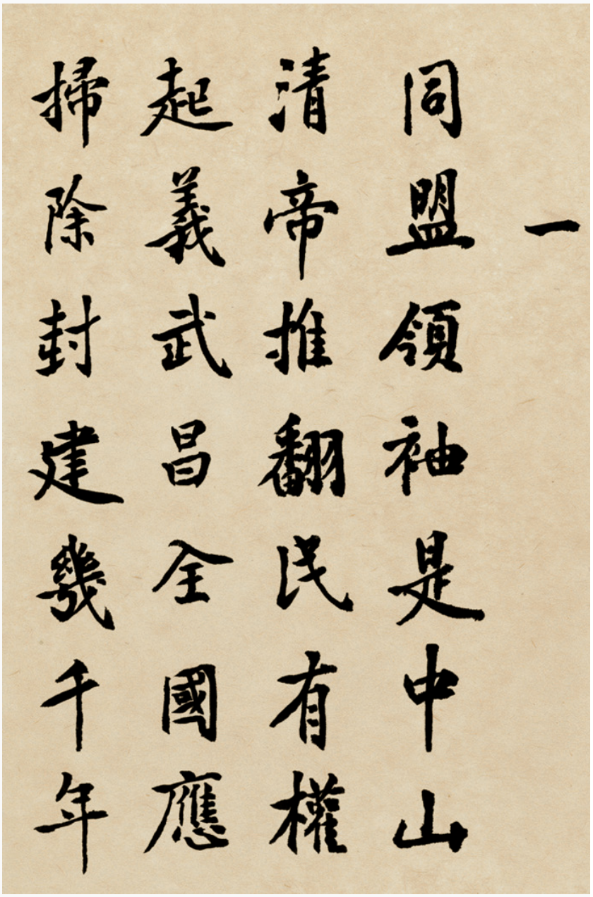 同盟领袖是中山,推翻清宝争民权。 起义武昌全国应,废除帝制几千年。
