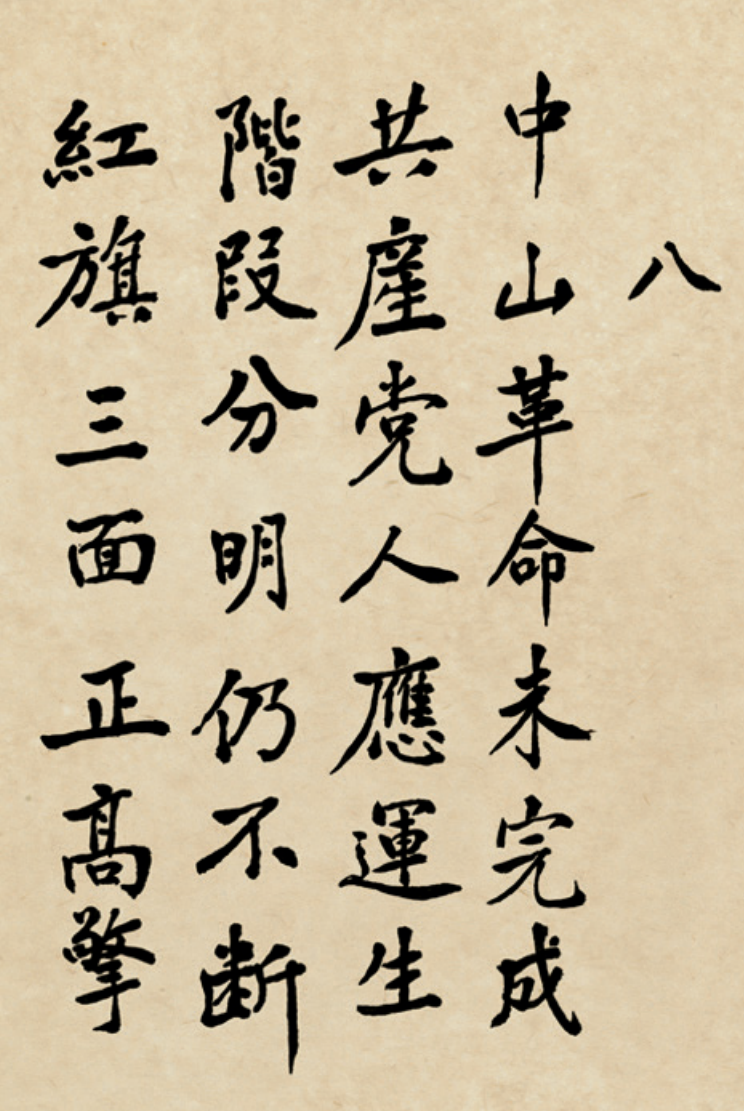 中山革命未完成,共产党人应运生。 阶段分明仍不断,红旗三面正高擎。
