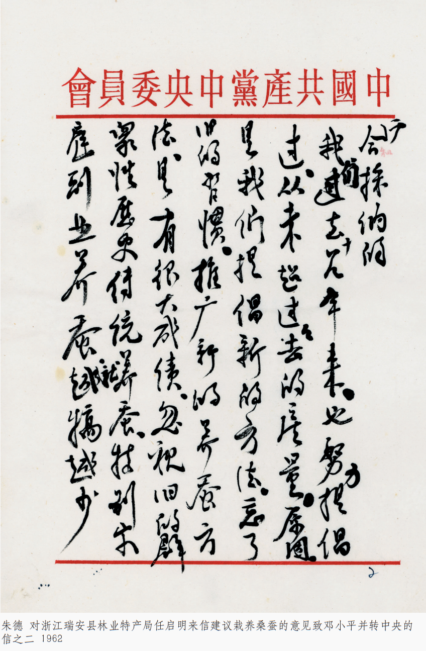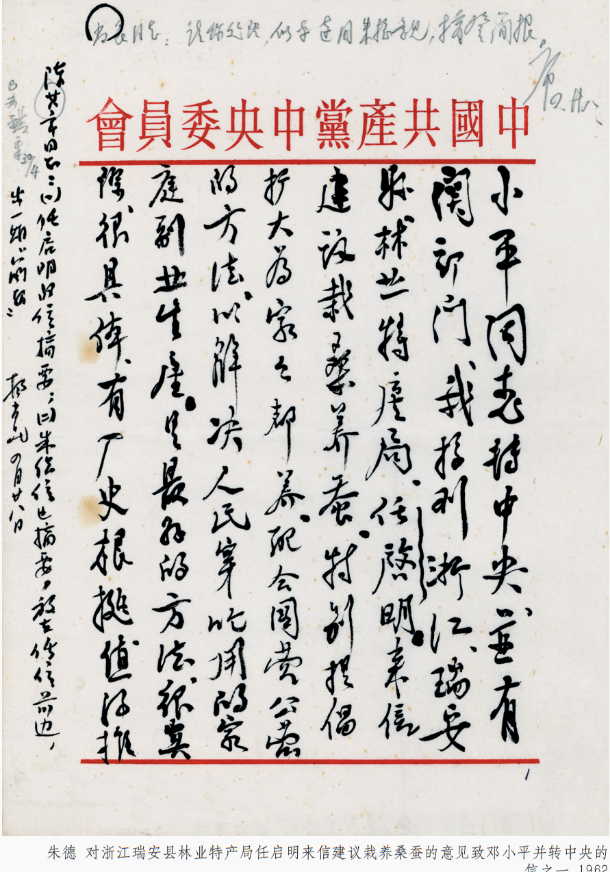 朱德 《对浙江瑞安县林业特产局任启明来信建议栽养桑蚕的意见致邓小平并转中央的信》 一九六二年