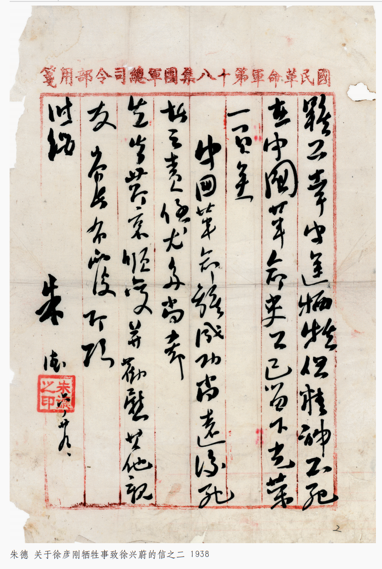 朱德 《关于徐彦刚牺牲事致徐兴蔚的信 》 一九三八年六月二十九日
