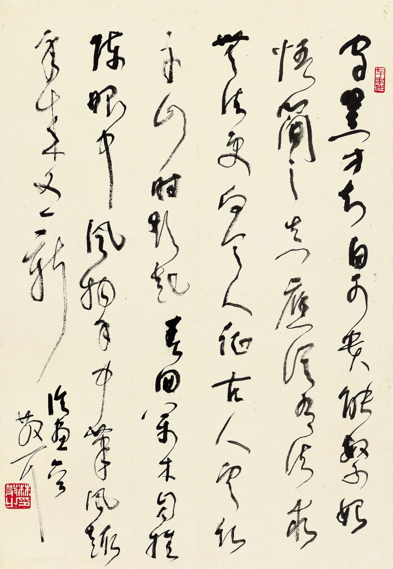 林散之《草书自作诗“论画一首”》 79×54cm 70年代 宋玉麟食砚斋藏 释文:守黑方知白可贵,能繁始悟简之真,应从有法求无法,更向今人证古人,云卧千山时欲起,春回万木自推陈,眼中风物手中笔,风趣年来又一新。 款署:论画一首,散耳。 钤印:七十年代(朱文)、林散之印(白文)