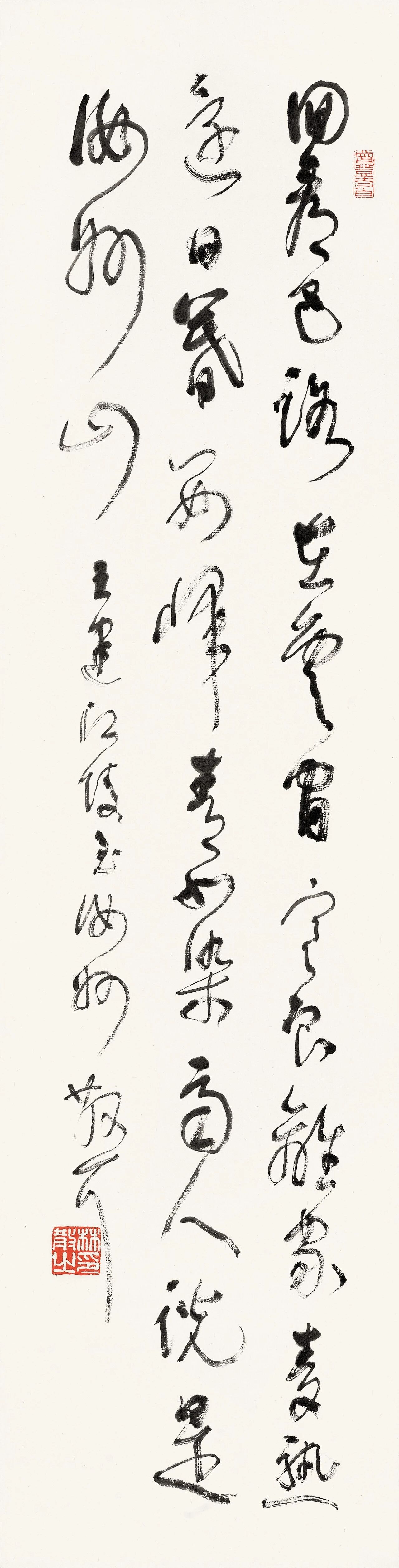 林散之《草书王建诗江陵使至汝州诗轴》 97×25cm 70年代 宋玉麟食砚斋藏 释文:回看巴路在云间,寒食离家麦熟还。日暮数峰青似染,商人说是汝州山。 款署:王建江陵至汝州,散耳。 钤印:曾登太白(朱文)、林散之印(白文)
