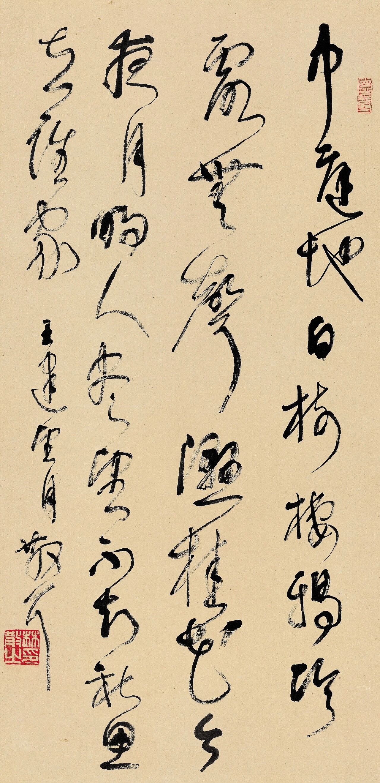 林散之《草书王建望月诗轴》 67×33.5cm 70年代 宋玉麟食砚斋藏 释文:中庭地白树栖鸦,冷露无声湿桂花。今夜月明人尽望,不知秋思在谁家? 款署:王建望月,散耳。 钤印:曾登太白(朱文)、林散之印(白文)