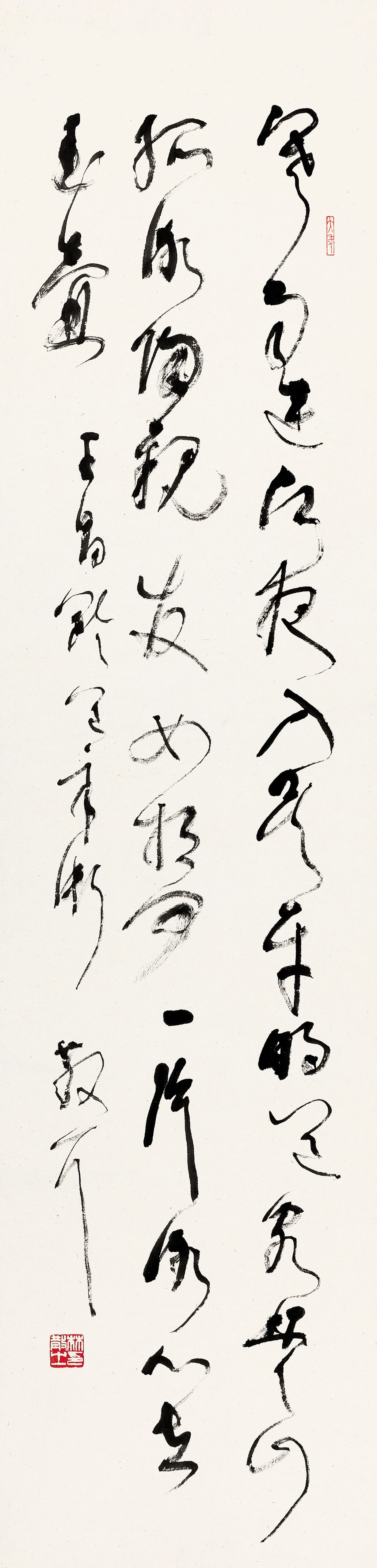 林散之《草书王昌龄送辛渐一首诗轴》 141×35cm 1976年 宋玉麟食砚斋藏 释文:寒雨连江夜入吴,平明送客楚山孤。洛阳亲友如相问,一片冰心在玉壶。 款署:王昌龄送辛渐,散耳。 钤印:大年(朱文)、林散之印(白文)