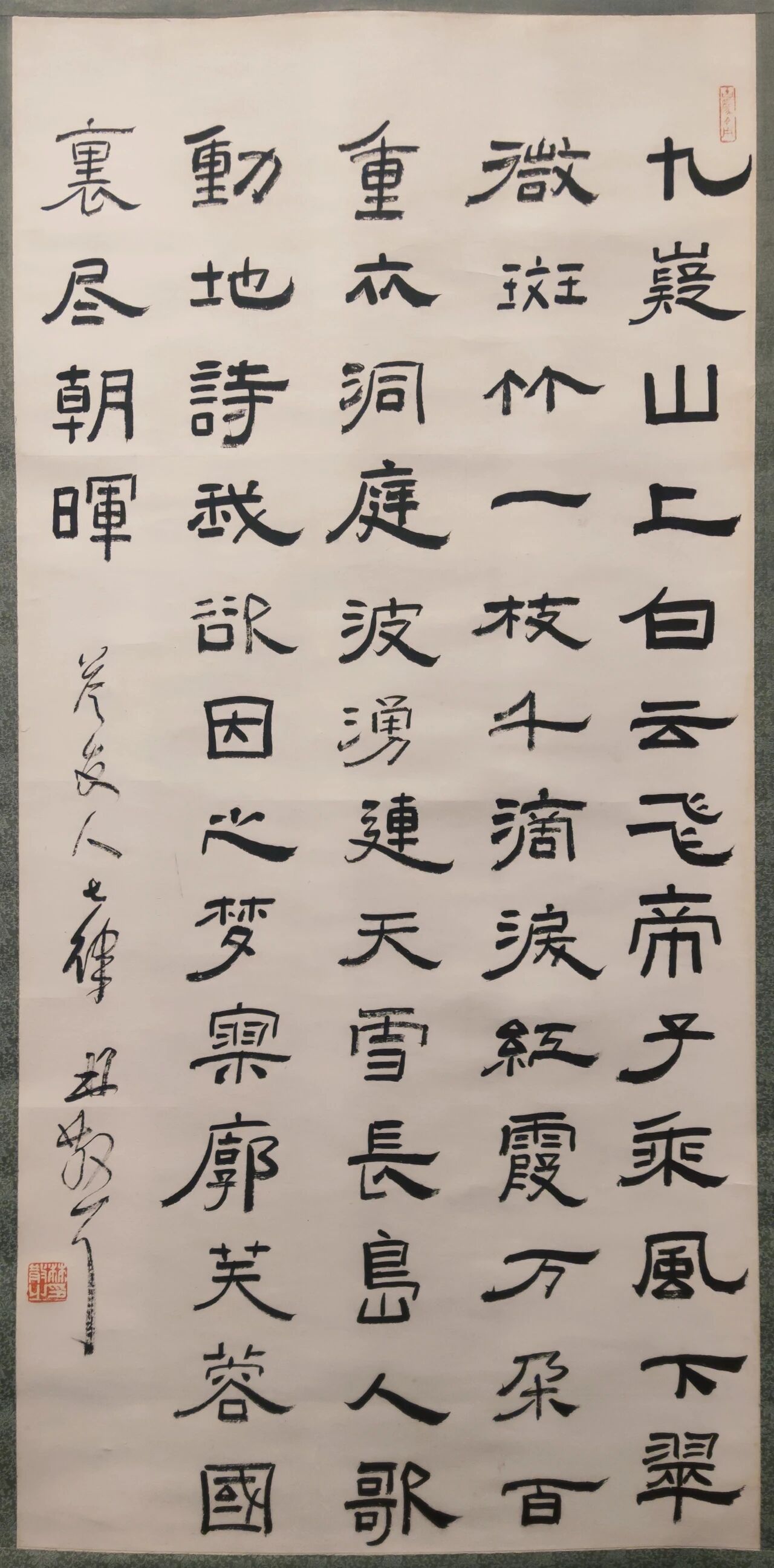 林散之《隶书毛泽东答友人七律诗轴》 70年代 马鞍山博物馆藏 释文:九嶷山上白云飞,帝子乘风下翠微。斑竹一枝千滴泪,红霞万朵百重衣。洞庭波涌连天雪,长岛人歌动地诗。我欲因之梦寥廓,芙蓉国里尽朝晖。 款署:答友人七律。林散之。 钤印:林散之印(白文)