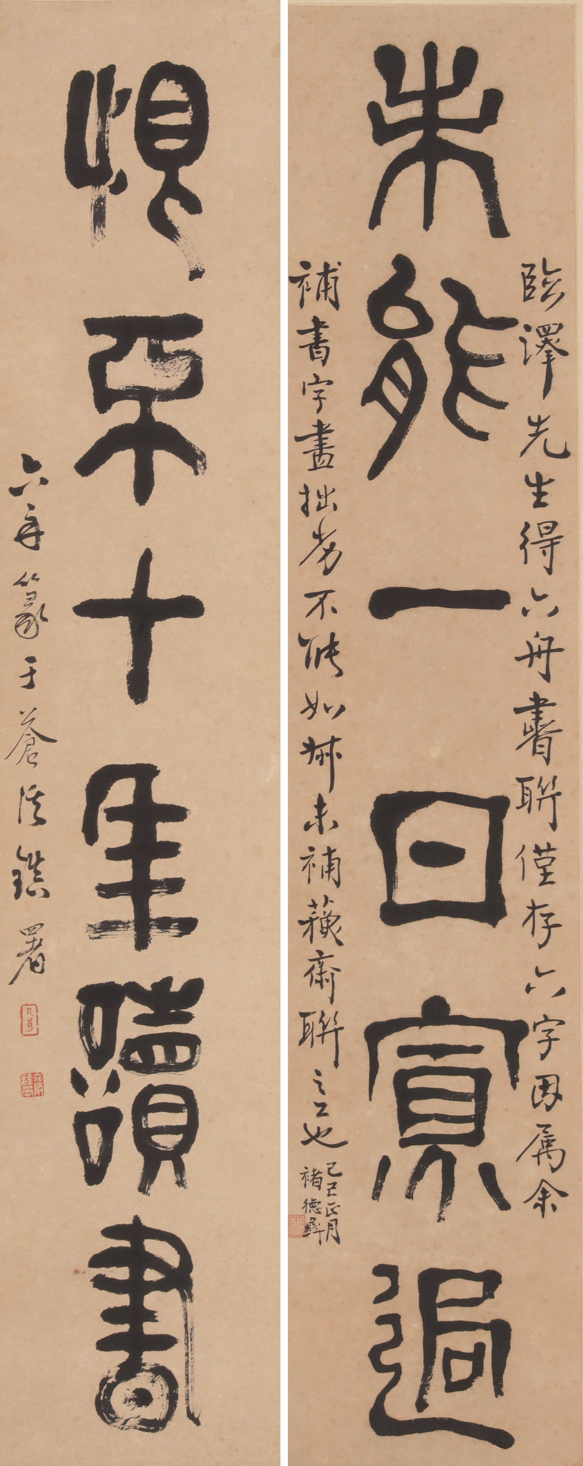 褚德彝题识:临泽先生得六舟书联,仅存六字,因属余补书,字尽拙劣,不能如叔未补苏斋联之工也。己巳正月,褚德彝。