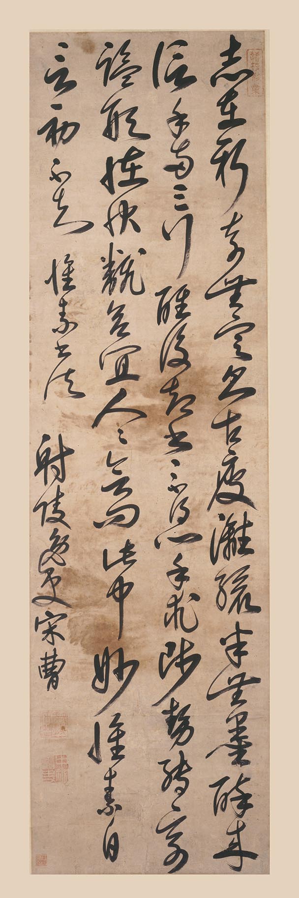 宋曹《草书怀素论书轴》纸本草书 157.9×48cm 上海博物馆藏 释文:志在新奇无定则,古瘦淋漓半无墨。醉来信手两三行,醒后却书书不得。心手相师势转奇,诡形怪状翻合宜。人人欲问此中妙,怀素自言初不知。 款识:怀素书法,射陵逸史宋曹。 钤印:蔬枰别业(起首、朱文)、射陵宋曹(朱文)、中秘旧史(白文)