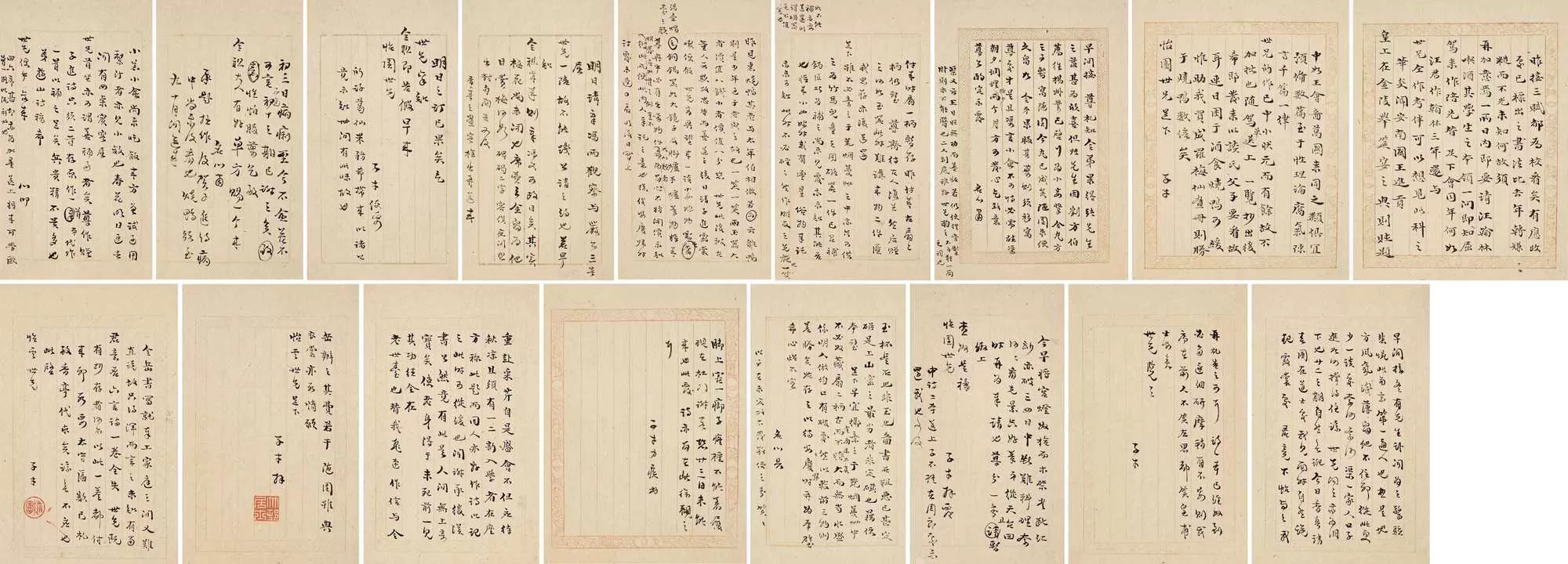 此札集袁子才致陶涣悦信札十四通,计十七页。上款人陶涣悦,字观文,号怡云,江苏上元(今南京)人。袁枚同年陶绍景孙。清嘉庆十二年(1807)举人,官至户部郎中。《随园诗话》卷十四有载:“叶书山侍讲,常为余夸陶京山同年之孙、名涣悦者,英异不群,时才八九岁。稍长,好吟诗,尤好余诗,大半成诵。”后来陶涣悦拜入随园门下,得袁枚衣钵。《小仓山房文集》卷三十一亦记有袁枚为之作《陶怡云诗序》。陶涣悦,是一个与袁子才极为熟稔友好的晚辈,所以每一开都写得特别舒展放松,然笔力健举,气力淳厚,因此幅幅都十分精彩。且保存完美,纸墨如新,是其精作无疑。