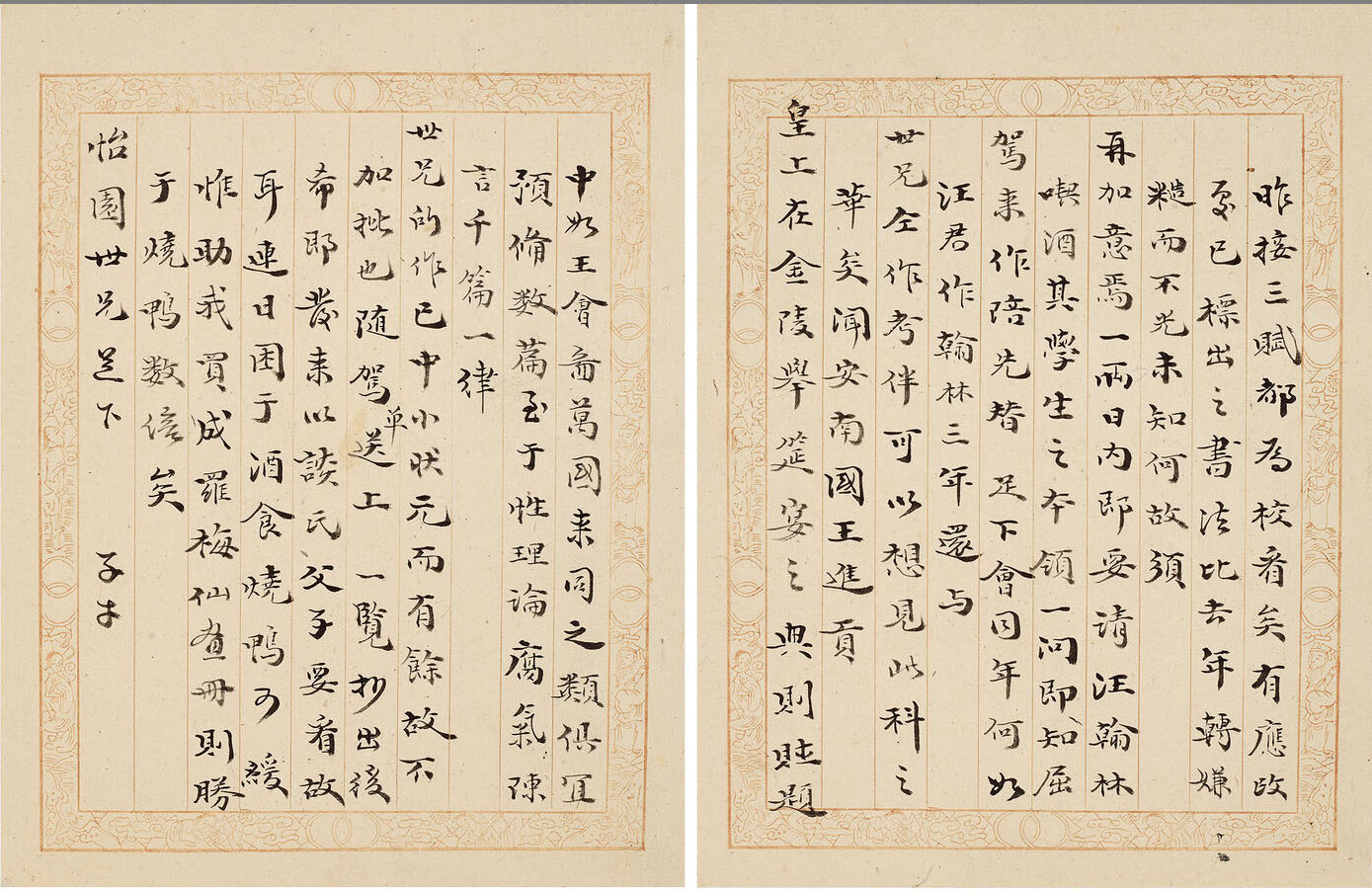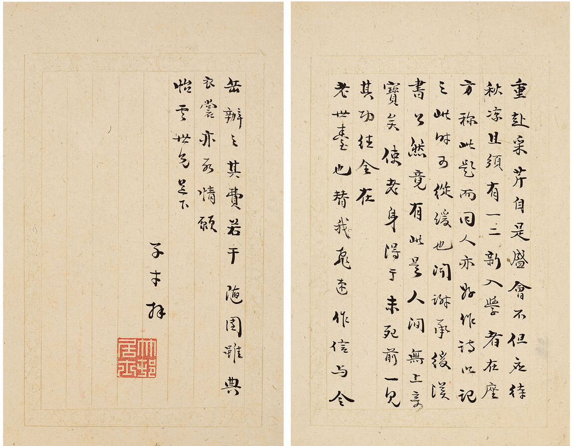 第一通释文:昨接三赋,都为校看矣。有应改处已标出之,书法比去年转嫌糙而不光,未知何故,须要再加意焉。一两日内,即要请汪翰林吃酒,其学生之本领,一问即知。屈驾来作陪,先替足下会同年何如?汪君作翰林三年,还与世兄仝作考伴,可以想见此科之华矣。闻安南国王进贡,皇上在金陵举筵宴之典,则赋题中,如《王会图》《万国来同》之类,俱宜预备数篇。至于性理论,腐气陈言,千篇一律。世兄所作,已中小状元而有余,故不加批也。随驾单送上一览,抄出后希即发来,以谈氏父子要看故耳。连日困于酒食,烧鸭可缓,惟助我买成罗梅仙画册,则胜于烧鸭数倍矣。怡园世兄足下。子才。