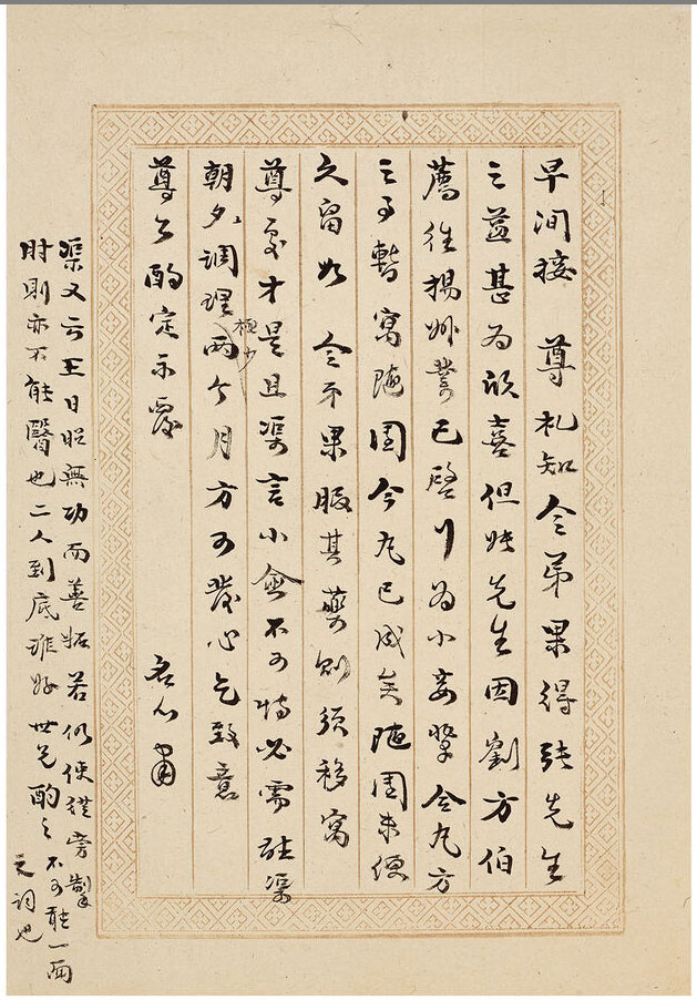 第二通释文:早间接尊札,知令弟果得张先生之益,甚为欣喜。但张先生因刘方伯荐往扬州,业已启行,为小妾辈合丸方之事,暂寓随园,今丸已成矣,随园未便久留。如令弟果服其药,则须移寓尊处才是,且渠言小愈不可恃,必需听渠朝夕调理,极少两个月,方可发心,乞致意尊公酌定示覆。名心肃。 渠又云王日昭无功而善妬,仍使从旁掣肘,则亦不能医也。二人到底谁好,世兄酌之,不可听一面之词也。