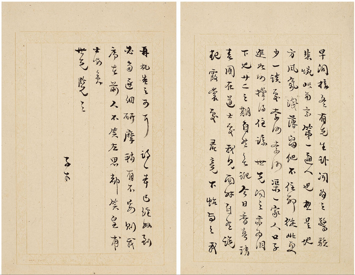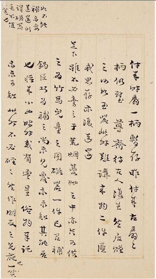 第十一通释文:玉杯是石也,非玉也,图书石粗恶已甚定磁,是上山窑之最劣者,非定磁也。藉使奉璧,足下早宜掷弃之于荒烟蔓草中,不必收藏。扇二柄,古而不特,大而无当(金面亦不真);水盛系明人仿,均口有破处,然以较前三物,则差胜矣,姑存之,以待安庆归时,再为奉璧,希心炤不宣。名心具。以事在未定,故不发,敬便之封,笑笑。
