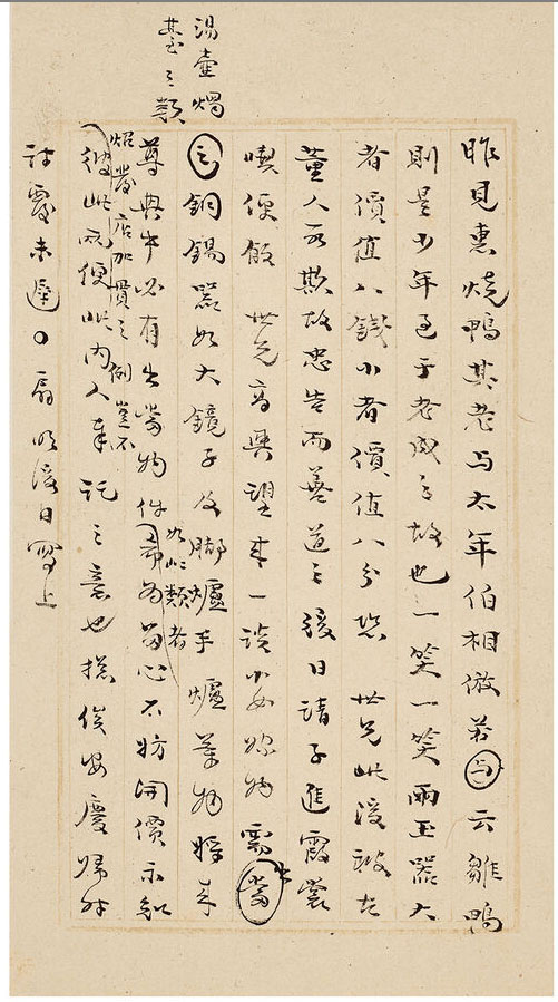第四通释文:昨见惠烧鸭,其老与太年伯相仿,若(与)云雏鸭,则是少年过于老成之故也,一笑一笑。两玉器大者价值八钱,小者价值八分,恐世兄此后被古董人所欺,故忠告而善道之,缓日请子进、霞裳吃便饭,世兄高兴望来一谈。小女嫁物需出(当之)铜锡器(汤壶烛台之类),如大镜子及脚炉、手炉等物,将来尊典中必有出当物件,如此类者,希为留心,不妨开价示知。炤发店加贯之例,岂不彼此两便,此内人奉托之意也。总俟安庆归时,讨覆未迟,扇明后日写上。