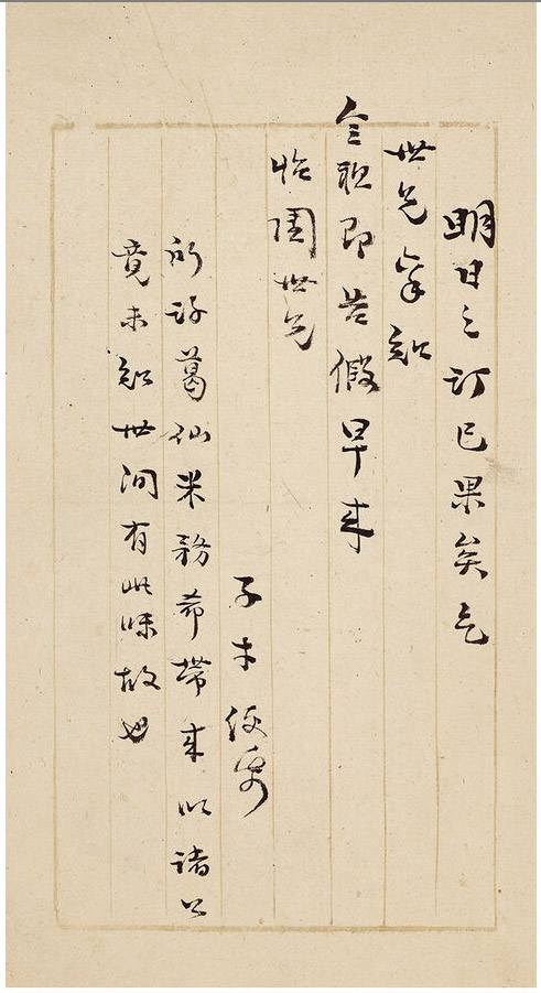第六通释文:明日之订已果矣,乞世兄禀知,令祖即告假早来。怡园世兄。子才便纸。