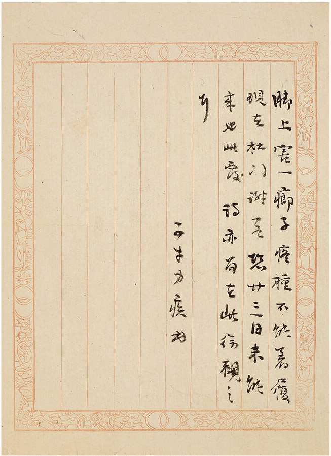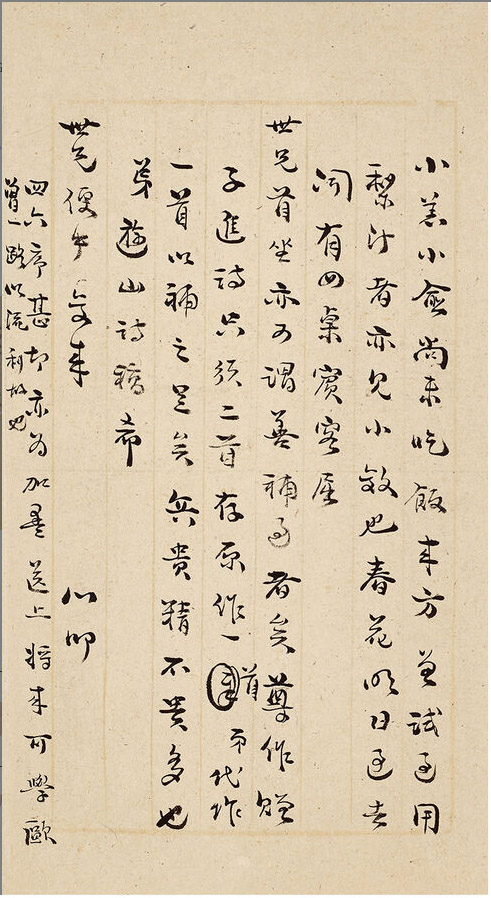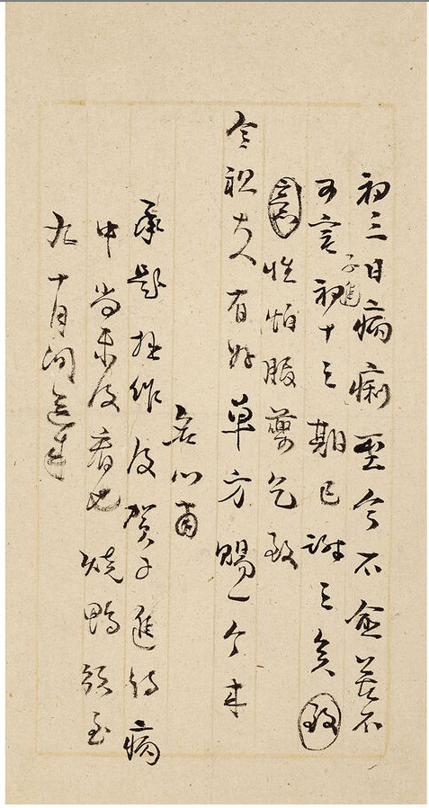第七通释文:初三日,病痢至今不愈,苦不可言。子进初十之期已谢之矣,(致意)性怕服药,乞致令祖大人有好单方赐一个来,名心肃。承题拙作及贺子进诗,病中尚未及看也,烧鸭须至九十月间送来。