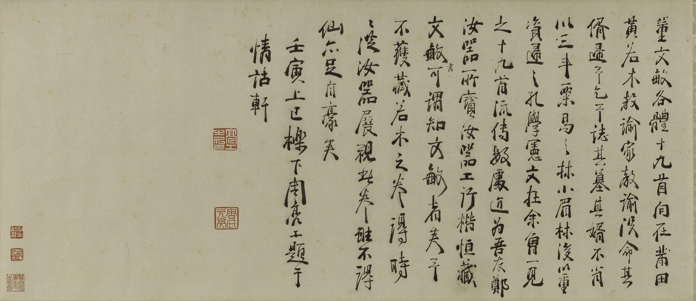 释文:董文敏各体十九首,向在莆田黄若木教谕家,教谕没,命其婿归予,乞予志其墓。其婿不肖,以三斗粟易之林小眉,林后以重资归之孔学宪文在,余曾一见之。《十九首》流传数处,近为吾友郑汝器所宝。汝器工行楷,恒藏文敏书,可谓知文敏者矣。予不获藏若木之卷,得时时从汝器展视此卷,虽不得仙,亦足以自豪矣。