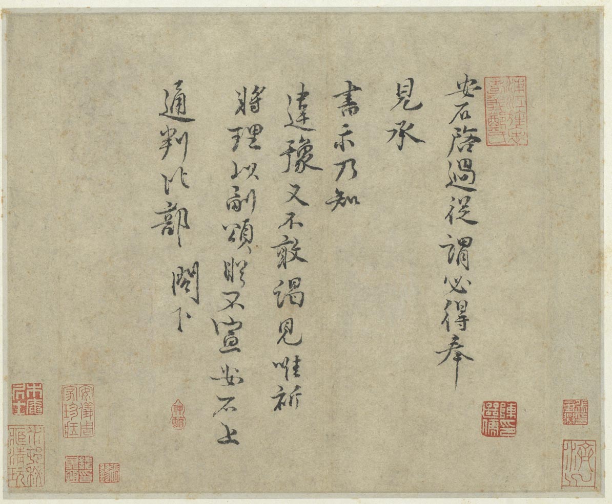 行书《过从帖》,是王安石给一位通判的复函,纵26厘米,横32.1厘米,现藏台北故宫博物院。其文不见于《王文公集》,体裁属“启”或“书”,但文字过于简略,内容难于确考。揣其文意约略可知,这位通判遇到了意外之事而又犹豫不决,王安石则请他好自为之。