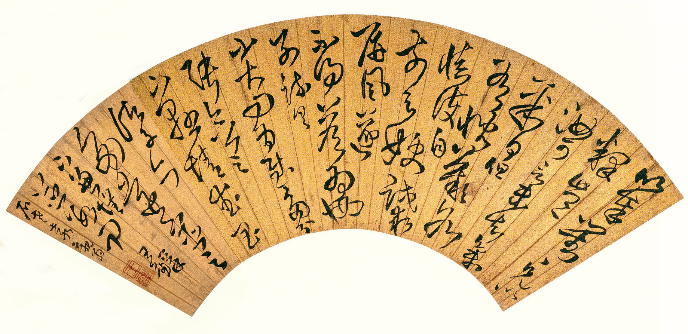 王铎《草书临阁帖扇面》无署年。草书。金笺。凡十八行,共七十四字。纵16.5cm,横51.5cm。中国国家博物馆藏。