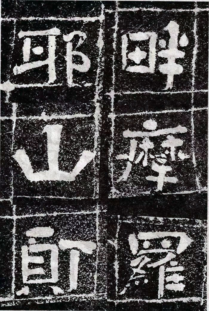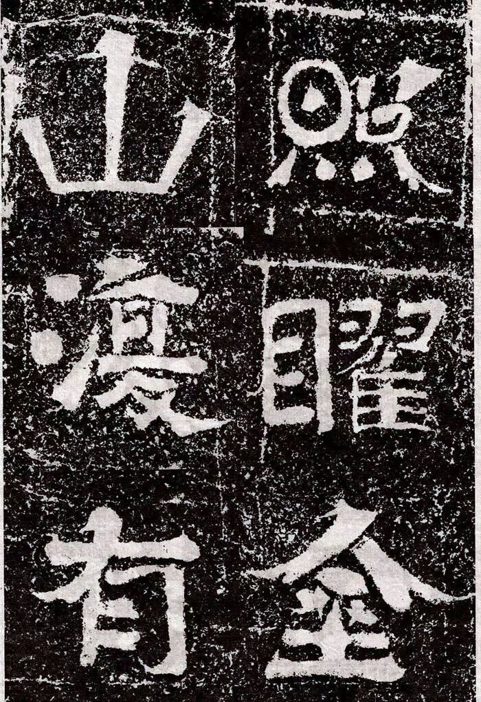大字《岗山入楞伽经》独具特色,康有为《广艺舟双楫》日:“魏碑大种有三:一日龙门造像,一日云峰刻石,一日冈山、尖山、铁山摩崖,皆数十种同一体者,龙门为方笔之极轨,云峰为圆笔之极轨,二种争盟,可谓极盛。四山摩崖通隶楷、备方圆,高浑简穆,为擘窠之极轨也。”岗山大字佛经皆以隶书结体,用笔上多施楷法,有意识地夸张起笔、收笔处入锋、出锋的效果。点笔皆作圆点,笔画转折处多用断笔,粗犷方峻,稚拙滑稽,乍一看装腔作势,实则是幽默诙谐,别具一番情趣。