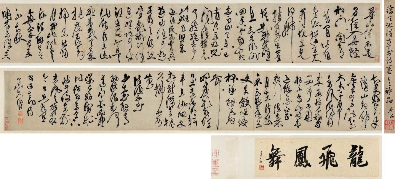 徐渭的手卷类作品为数不少,书法主要以行书作品居多,草书作品较少。《草书白燕诗卷》、《草书春雨诗卷》是其草书手卷的代表作品,《行书自书诗卷》为楷、行、草相杂,变化多变。本作《李太白诗卷》在雄浑恣肆处与《草书春雨诗卷》较为接近,低昂婉转处过之;前者于章法上,字距较密,气势浩大,绵密处不能插针,宽阔处亦能走马。本卷草书,完全是情感主导者一切,其用笔之狂、线条之变、结字之奇、恢弘之势,皆是其内心的真实写照。徐渭将作书视为抒发自己情感的途径,其摆脱礼法的束缚,虽主张要学古人书但不为古法所束缚,将情感完全付诸笔尖,挥挥洒洒、将自己的真性情表达出来。徐渭将自己在现实生活中的郁结之情赋予书法的线条之中,将其看作是生命的一种表现形式。