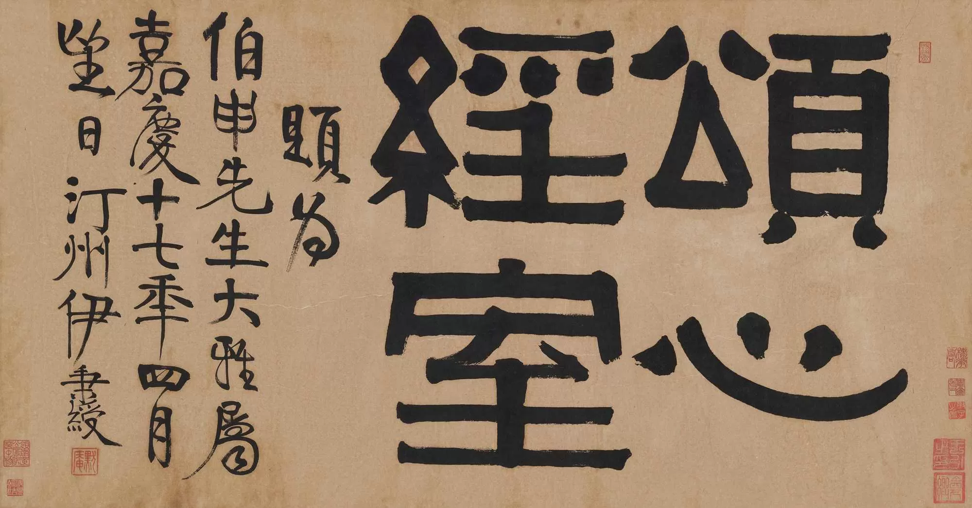嘉庆十七年(1812)四月望日,汀州伊秉绶为时贤王引之题写“颂心经室”隶书斋额,并以行书题款:“题为伯申先生大雅属。嘉庆十七年四月望日,汀州伊秉绶。”距今已逾二百余年,然其墨迹沉雄挺拔,气局森然,至今观之,犹觉风骨照人,余韵萦怀。